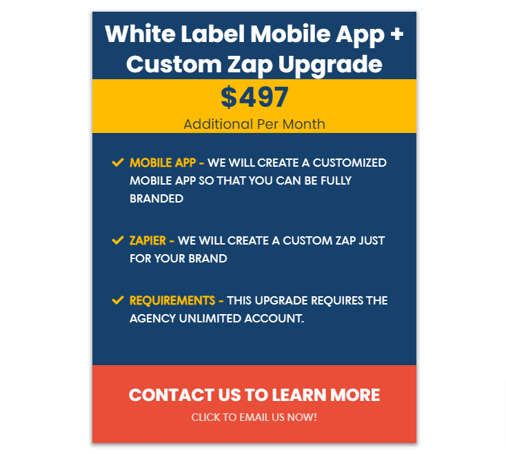 - White Label Upgrade: Gives you the ability to white-label the entire GoHighLevel platform